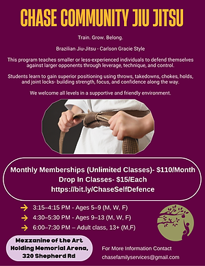 Chase Community Jiu Jitsu offers Brazilian Jiu-Jitsu instruction in the Carlson Gracie style, providing a supportive environment for people of all ages and experience levels to build confidence, focus, and physical strength.